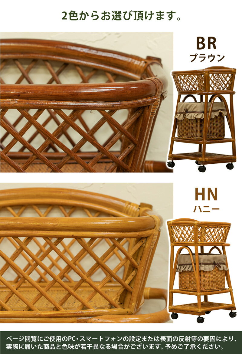 カラー ブラウン(BR) ハニー(HN) サイズ (W)幅47.5cm×(D)奥行36.5cm(キャスター含)×(H)高さ79cm 材質 天然籐(ラッカー塗装)、かごカバー(綿30%・ポリエステル70%) キャスター4個(2個ストッパー付) 重量 4.5kg 梱包サイズ W48.5×D375×H75.5cm 5.8kg 送料 送料無料 沖縄県配送不可 原産国 インドネシア
