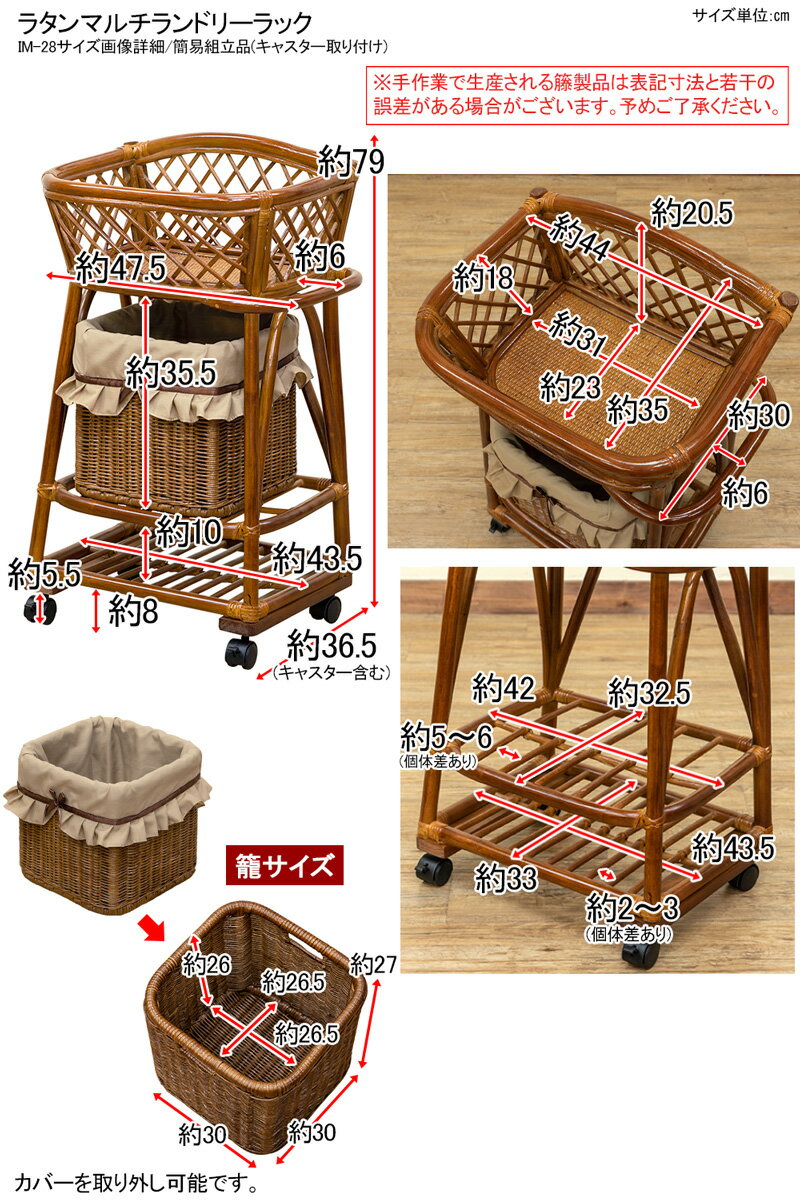 商品番号 IM-28 商品説明 簡易組立品(キャスター取付のみ) 通気性抜群で軽くて丈夫!脱衣所、洗面所にぴったりのラタン(籐)ランドリーラック! アジアンテイストの優しいデザインでリビング収納など場所を選ばず使えます。